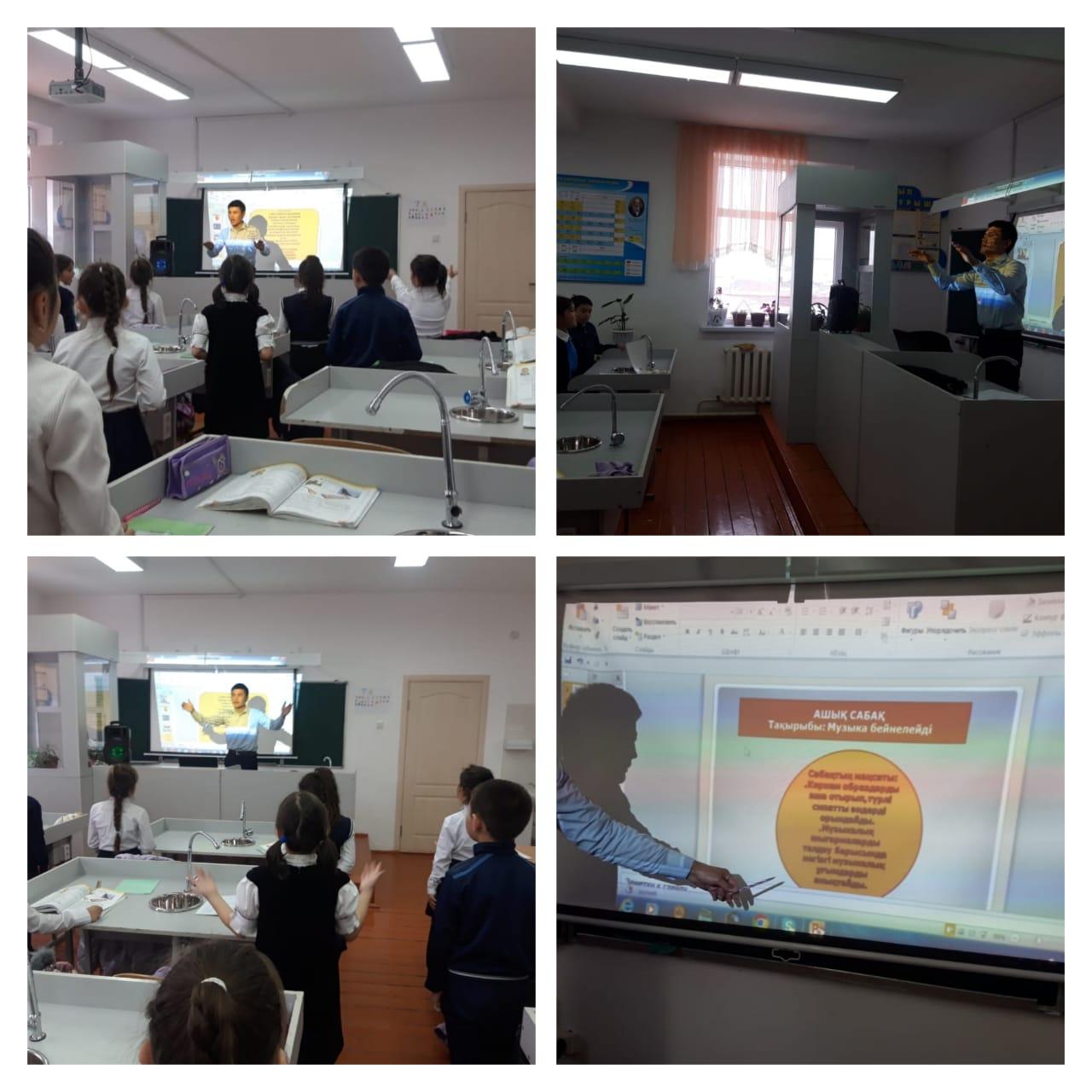 "МУЗЫКА БЕЙНЕЛЕЙДІ ” тақырыбында ашық сабақ өткізді. Мақсаты:Көркем образдарды аша отырып, түрлі сипаттағы әндерді орындайды. Музыкалық шығармаларды талдау барысында негізгі музыкалык ұғымдарды анықтайды және ажыратады.