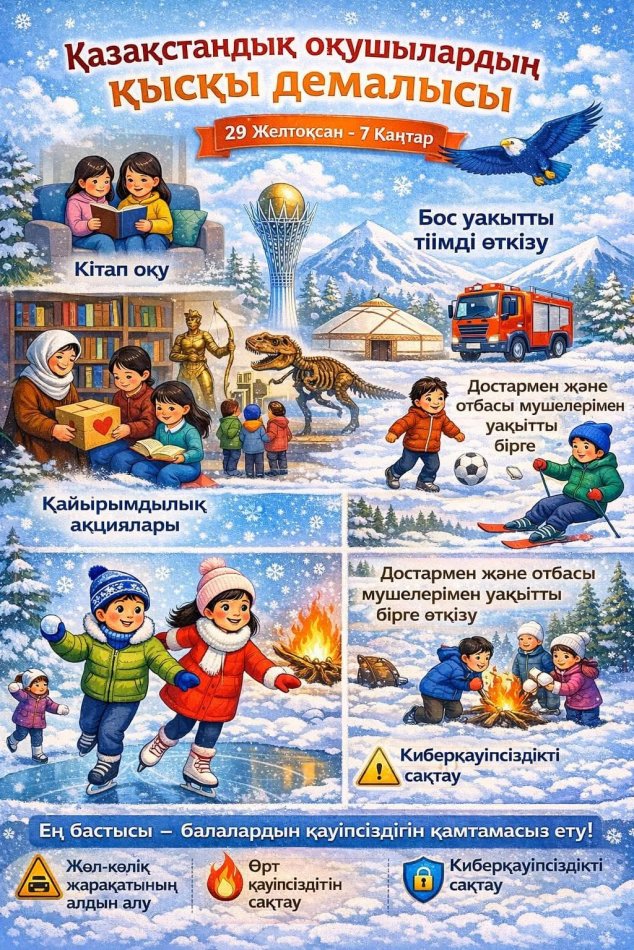 Мектеп оқушыларының қысқы демалыстағы бос уақытын тиімді өткізу және жеке тұлғалық қасиеттерін дамыту маңызды. Осы мақсатта «Адал азамат» біртұтас тәрбие бағдарламасы аясында бірқатар іс-шаралар көзделген.