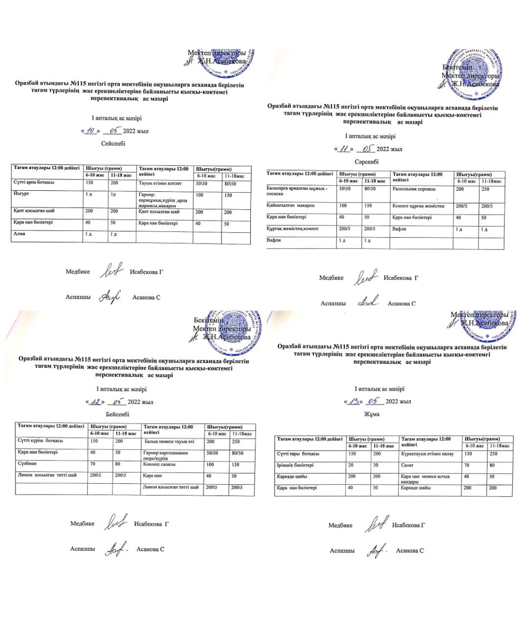 Мектеп оқушыларына арналған мамыр айының ас мәзірі » «№115 Оразбай атындағы негізгі орта мектебі» КММ